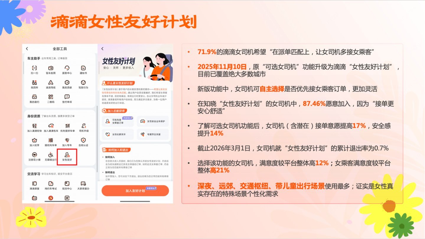 “女性友好计划”是滴滴在2025年11月对“可选女司机”功能的升级:女乘客可以个性化设置偏好,选择优先呼叫女司机。女司机也可以自主选择加入或退出优先接女乘客,接单更灵活。据调研数据,该功能使女司机安全感提升14%,满意度较平台整体高12%。乘客在深夜、远郊、交通枢纽、带儿童出行场景使用该功能最多,证实是女性真实存在的特殊场景个性化需求。