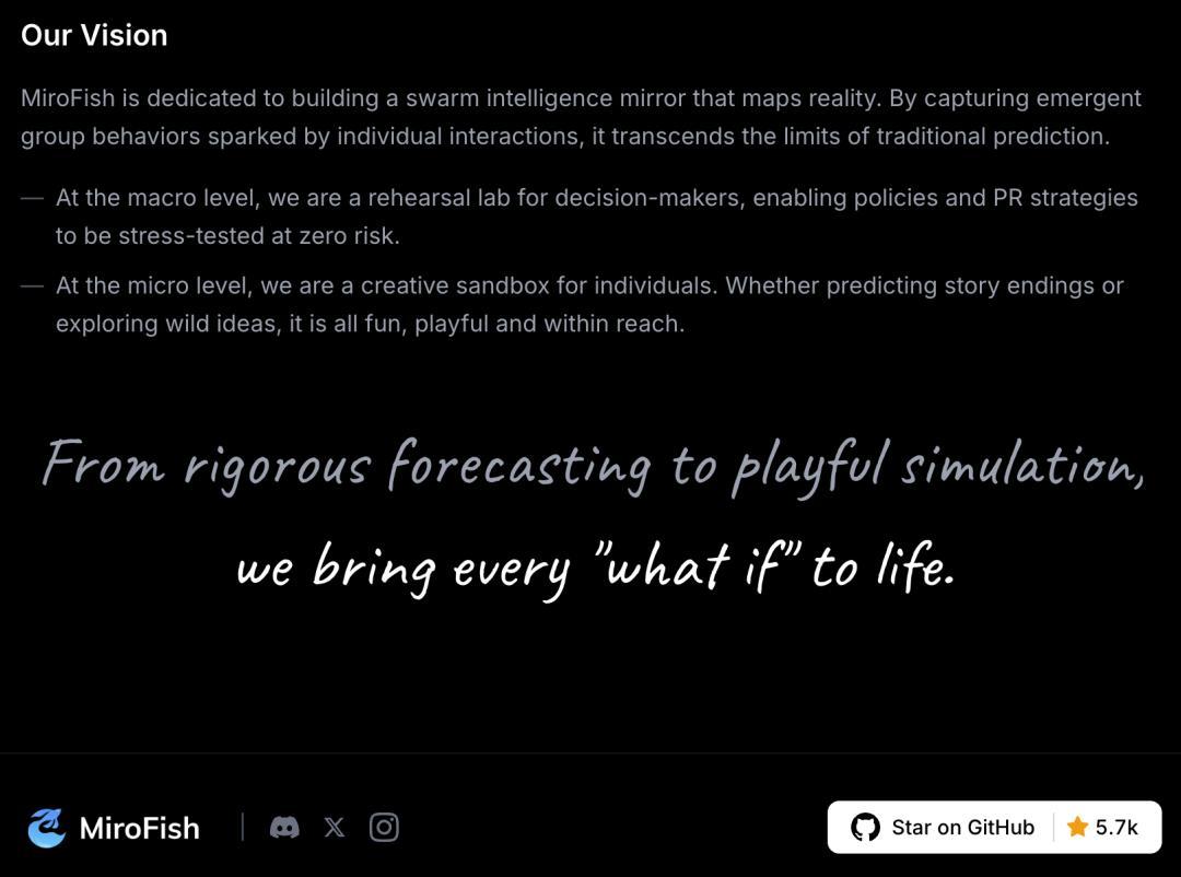 MiroFish团队的目标很明确:打造一个能够模拟现实世界的AI预测系统,从金融市场到社会事件,从商业决策到创意实验,让未来在数字世界中提前演化。