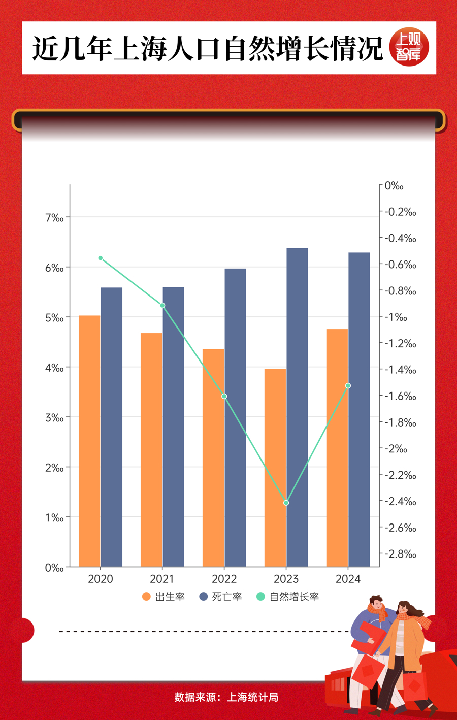 不可否认,尽管2024年的出生率较2023年略有回升,但上海低生育率和高龄化导致的人口自然减少趋势持续。常住人口自然增长率略有下跌。