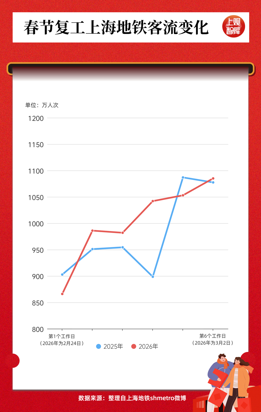 从地铁数据来看,3月2日,上海地铁总客流为1085万,已经基本恢复到节前高峰。节后以来,除第一天受错峰返程影响和2月28日调休外,今年的地铁客流均高于2025年。6个工作日平均客流超1002万人次,显著高于去年的979万人次。